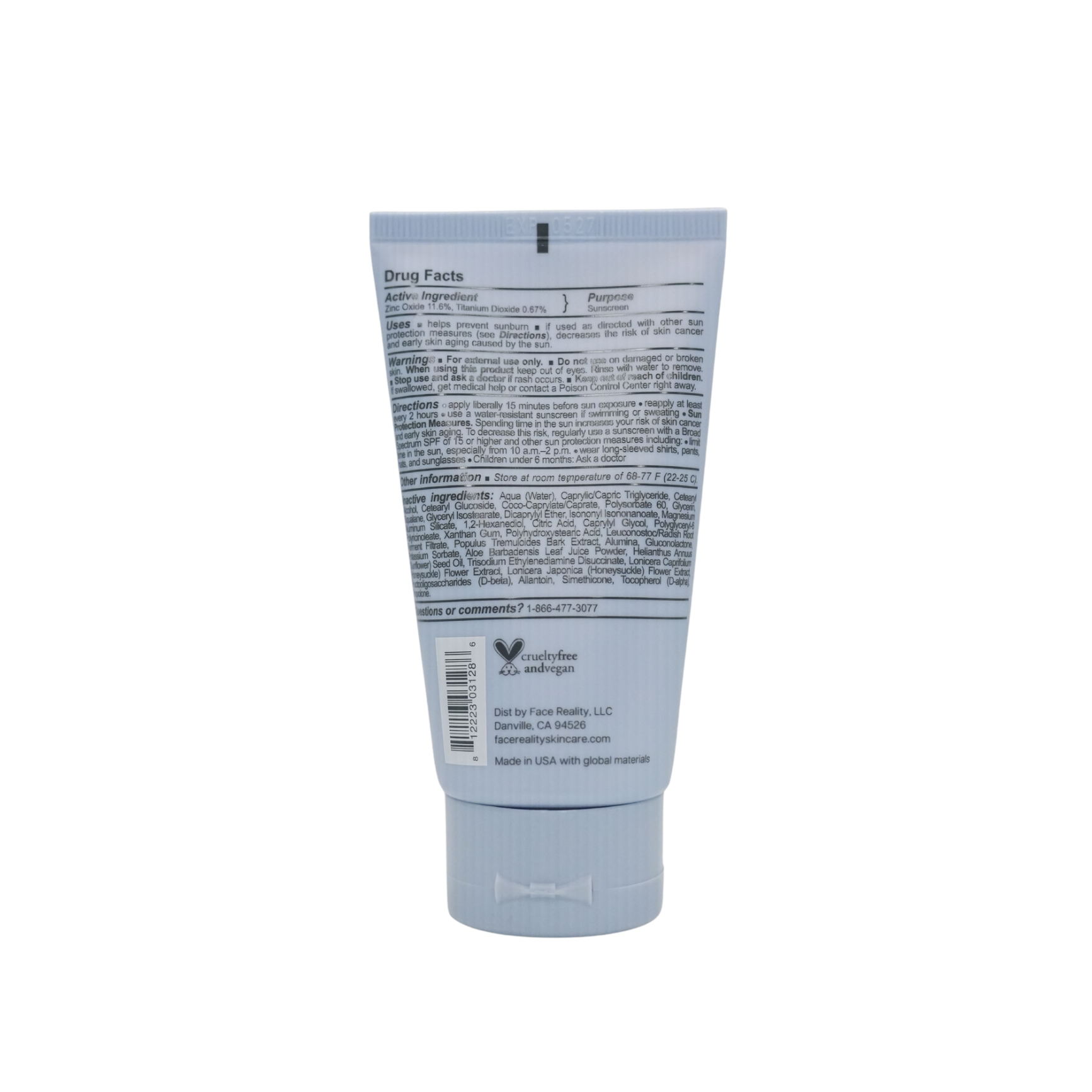 Active Ingredents: 11.6% Zinc Oxide, 0.67% Titanium Dioxide Inactive Ingredients: Aqua (Water), Caprylic/Capric Triglyceride, Cetearyl Alcohol, Cetearyl Glucoside, Coco-Caprylate/Caprate, Polysorbate 60, Glycerin, Squalane, Glyceryl Isostearate, Dicaprylyl Ether, Isononyl Isononanoate, Magnesium Aluminum Silicate, 1,2-Hexanediol, Citric Acid, Caprylyl Glycol, Polyglyceryl-6 Polyricinoleate, Xanthan Gum, Polyhydroxystearic Acid, Leuconostoc/Radish Root Ferment Filtrate, Populus Tremuloides Bark Extract, Alumina, Gluconolactone, Potassium Sorbate, Aloe Barbadensis Leaf Juice Powder*, Helianthus Annuus (Sunflower) Seed Oil, Trisodium Ethylenediamine Disuccinate, Lonicera Caprifolium (Honeysuckle) Flower Extract, Lonicera Japonica (Honeysuckle) Flower Extract, Fructooligosaccharides (D-beta), Allantoin, Simethicone, Tocopherol (D-alpha), Tropolone